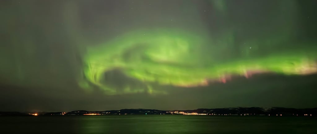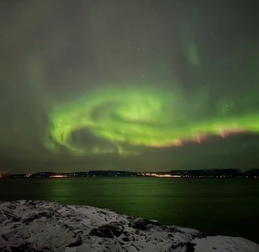 Wir haben viel miteinander geredet, bis es auf einmal hieß, dass es draußen Polarlichter gibt. Wir sind also direkt raus und tatsächlich waren sie über der Stadt leicht erkennbar. Nicht richtig grün, sondern eher gräulich, aber trotzdem total cool. Als ich dann mit den anderen heim bin, habe ich nochmal die Polarlicht-App geprüft und gesehen, dass es am Abend noch viel mehr Polarlichter geben soll. Um die zu sehen, habe ich dann ein paar Leute, die ich hier kennengelernt habe, angeschrieben und zwei gefunden, die Lust hatten, circa 25 Minuten an den Strand zu fahren, der etwas nördlich von der Stadt liegt. Dafür habe ich mich sehr warm (2 lange Unterhosen, 4 Lagen oben) eingepackt und bin dann mit der Kamera im Gepäck. Als wir aus dem Bus ausgestiegen sind, konnten wir leicht Polarlichter sehen, die aber immer noch mehr wie graue Wolken aussahen. Da die Vorhersage gesagt hat, dass es noch stärker wird, sind wir in der Kälte geblieben und haben gewartet.